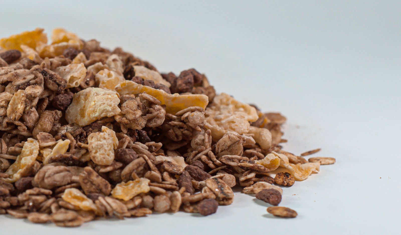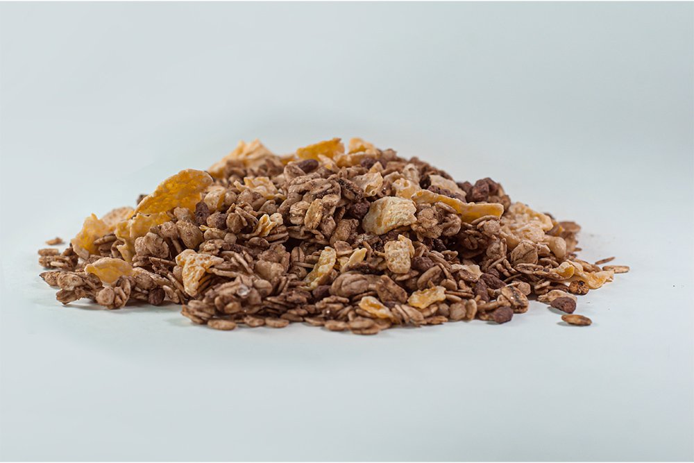 Aveia em flocos, açúcar cristal, flocos de milho, açúcar mascavo, fibra de mandioca, flocos de milho sabor chocolate, flocos de arroz, três grãos (milho, arroz e aveia), cacau em pó, coco em flocos, extrato de alecrim e extrato de urucum. CONTÉM GLÚTEN.