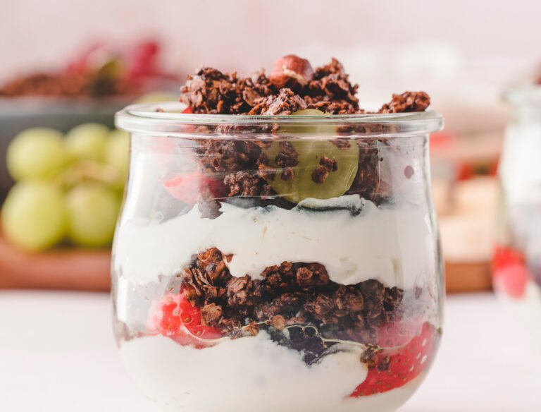 Em um copo ou taça, monte em camadas: iogurte, frutas, Granola e repita as camadas até preencher o copo.
